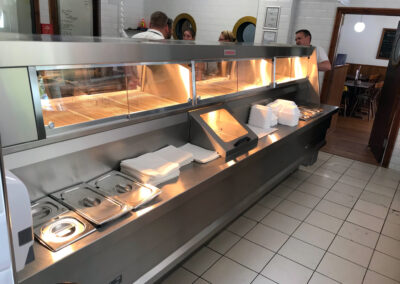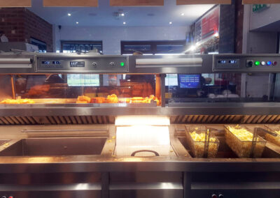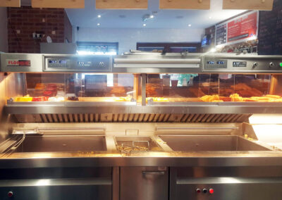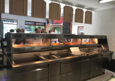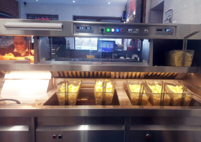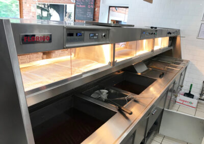 The range has 2 high-efficiency flat bottom fish pans, 2 high-efficiency 3 basket chip pans, active triple filtration, halo lighting and 2 four pot bain maries and cup dispensers on each end of the range, providing a smooth flow of service.